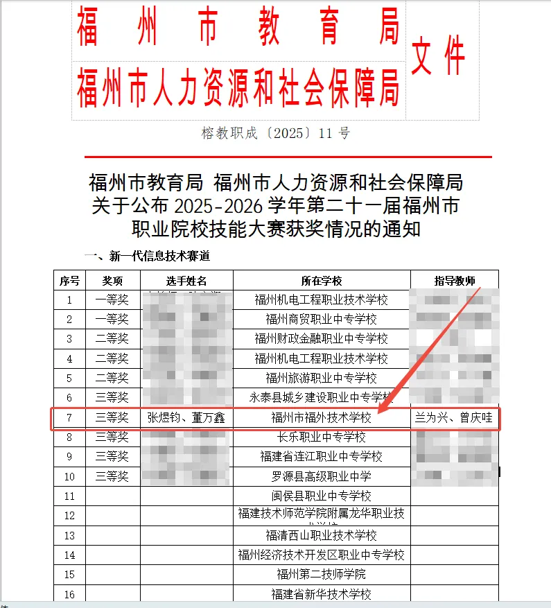 近日,福州市教育局与福州市人力资源和社会保障局联合公布了2025—2026学年第二十一届福州市中职职业院校技能大赛获奖名单。本次大赛吸引了全市27所中职、技工院校的678名精英选手参与,覆盖22个核心技能赛道,竞争异常激烈。在备受关注的新一代信息技术赛道中,福外技术学校学子张煜钧、董万鑫凭借扎实的专业技能和出色的现场发挥,荣获三等奖,总成绩位列全市第七名。