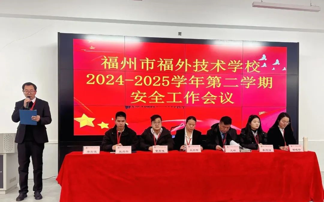 为进一步加强校园安全管理,筑牢校园安全防线,2025年2月24日上午9点,福州市福外技术学校在阶梯教室召开2024-2025学年第二学期全体教师安全工作会议。会议由蒋英俊老师主持,王琳校长、史东梅校长分别作重要讲话,全体教师参加会议。